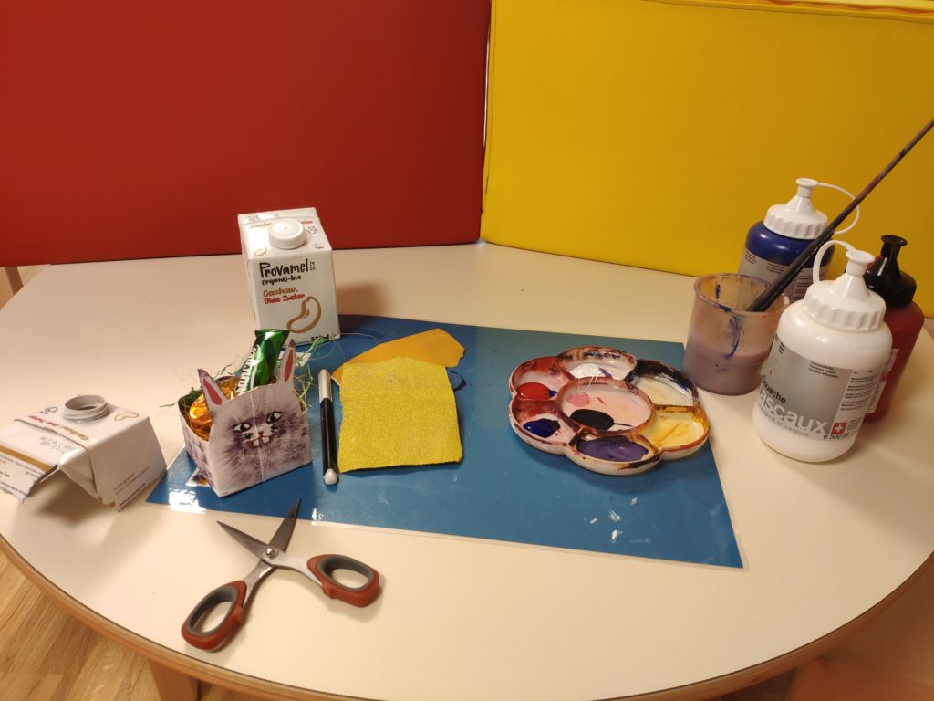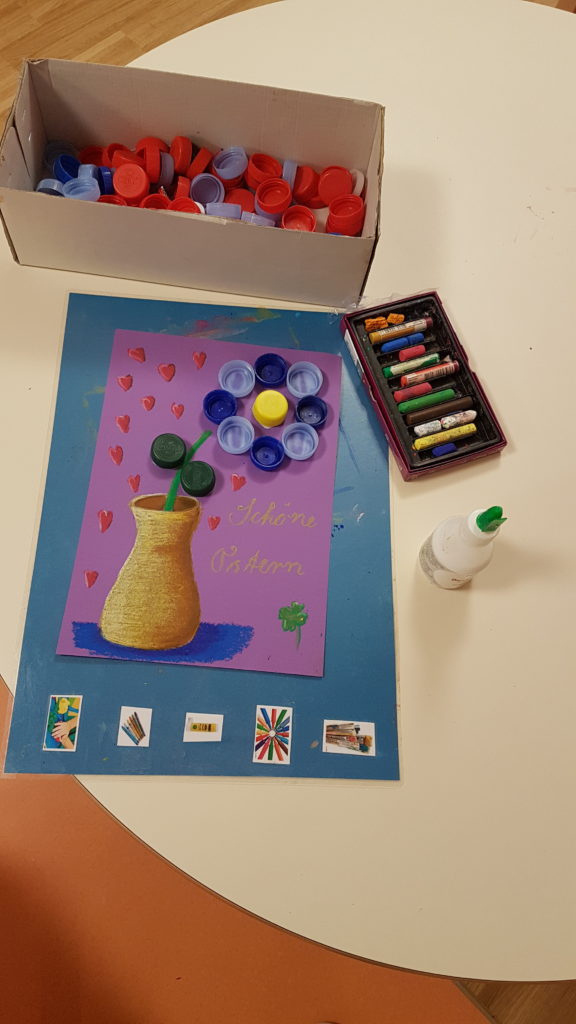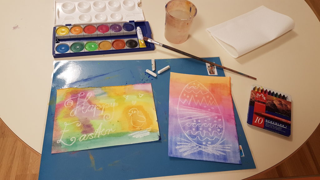 Zuerst mit weissem Neocolor, Wachsstift oder Kerzenende etwas vormalen und dann wie durch Zauberhand mit dem Pinsel und Wasserfarben herzaubern.